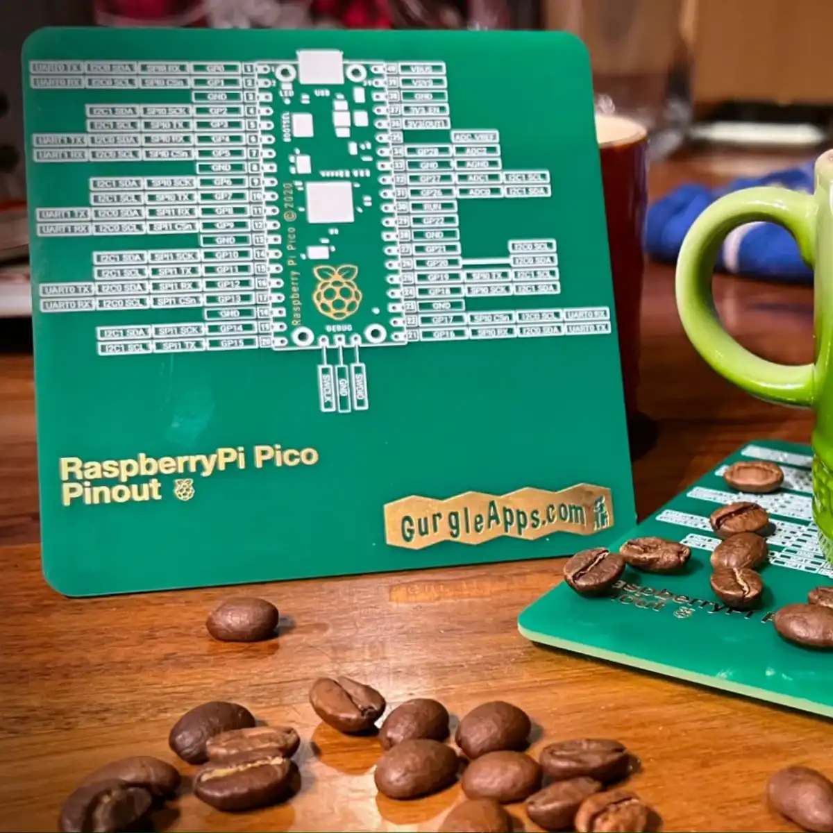 A stylish PCB coaster featuring the Raspberry Pi Pico pinout diagram