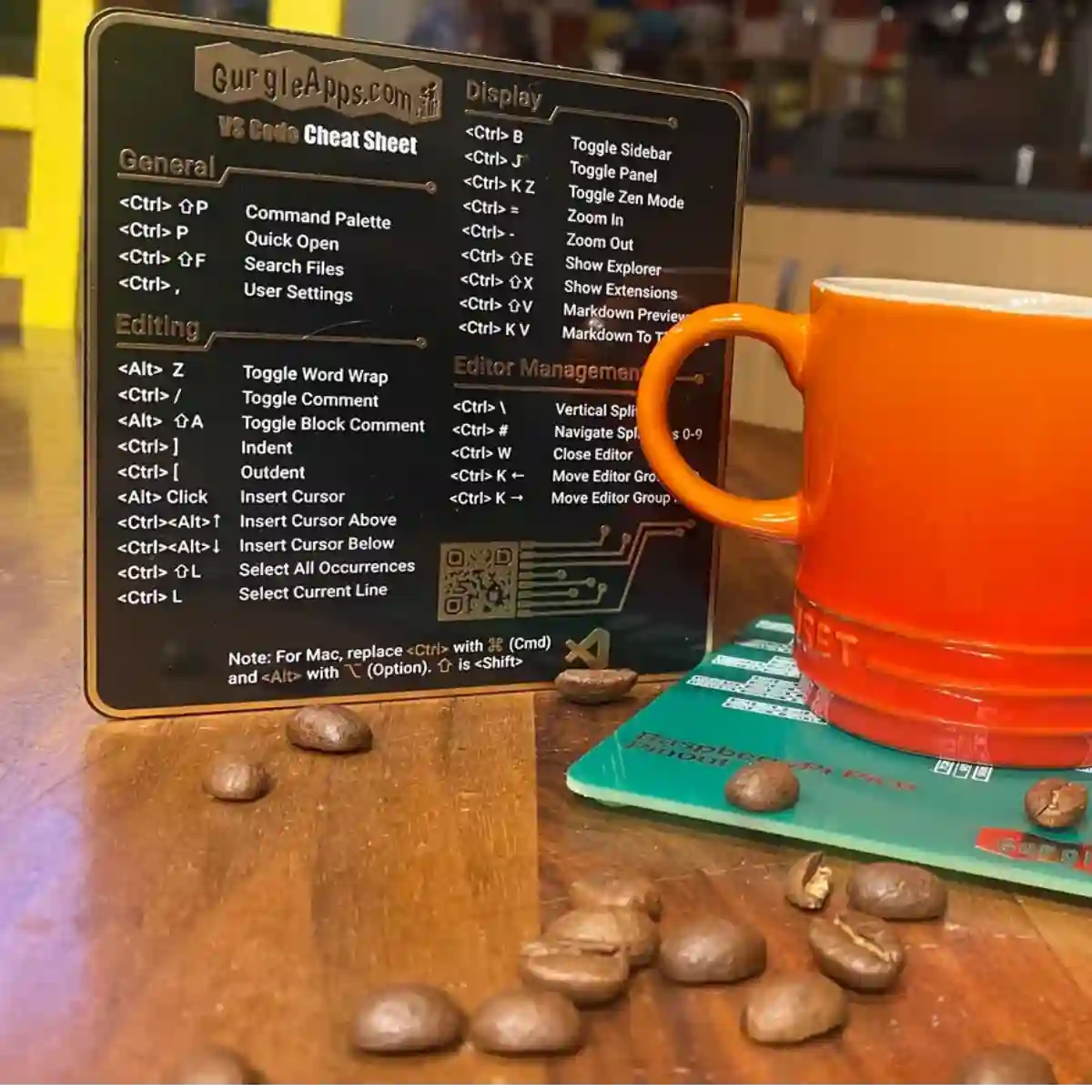 A PCB coaster featuring a Visual Studio Code keyboard shortcut cheat sheet.